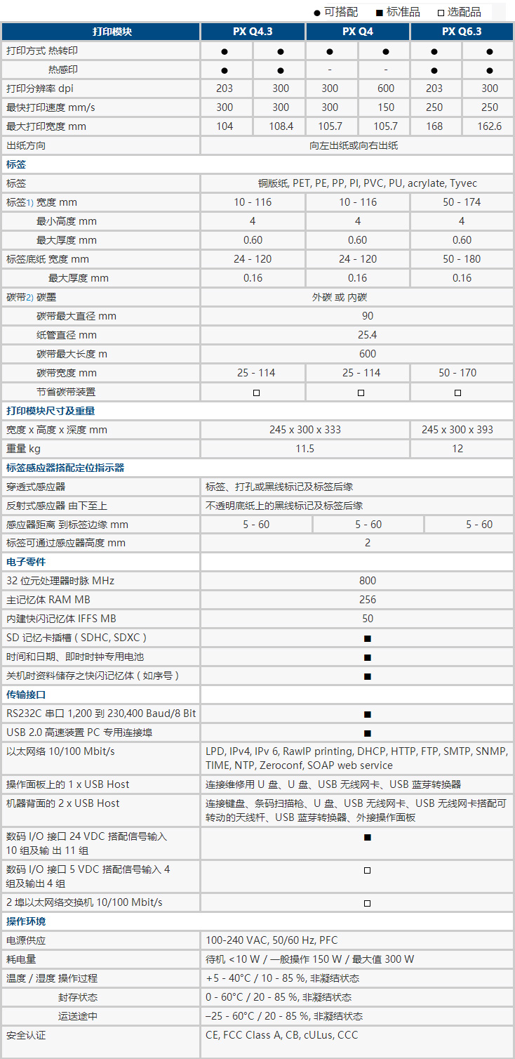 所有打印模塊皆提供向左及向右出紙的版本。使用 PX Q4 時可選用 300 及 600 dpi 的打印分辨率。PX Q4.3 及 PX Q6.3 提供了 203 及 300 dpi 的選擇。